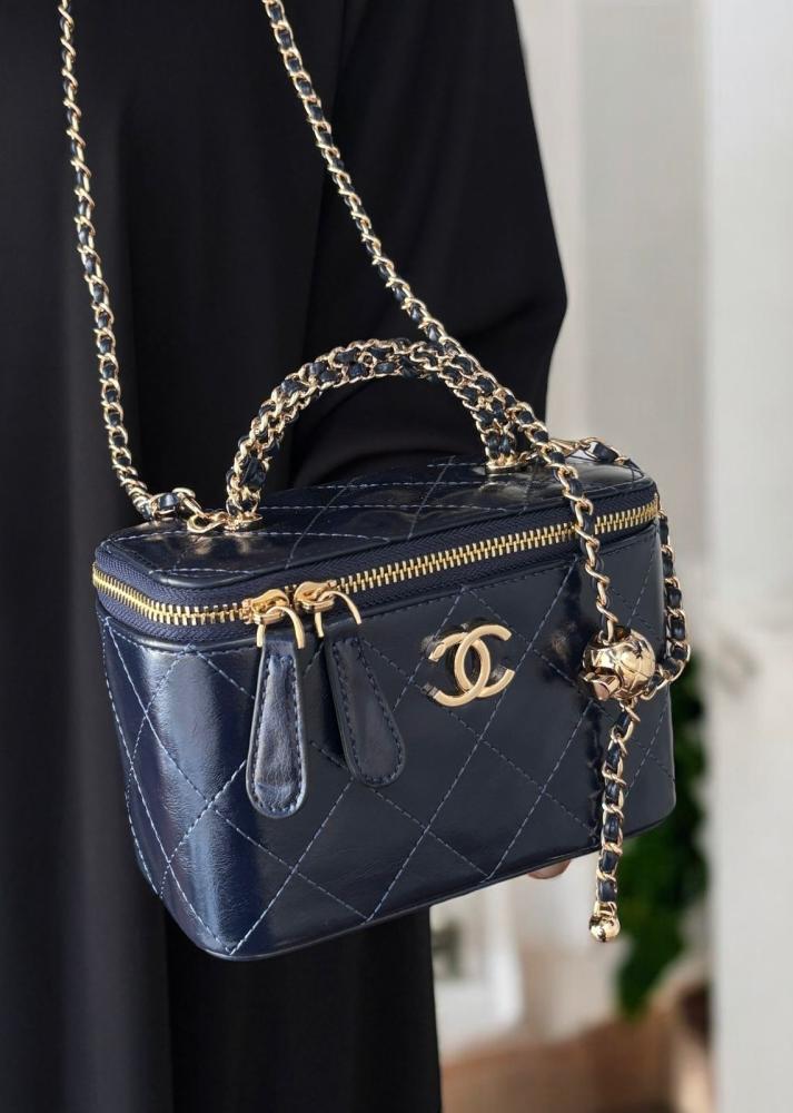 إطلالة فاخرة تجمع بين الجلد اللامع الفاخر والتصميم الكلاسيكي الأنيق، مع لمسة السلسال الذهبي وشعار شانيل الأيقوني. قطعة استثنائية تضيف فخامة لكل مناسبة.